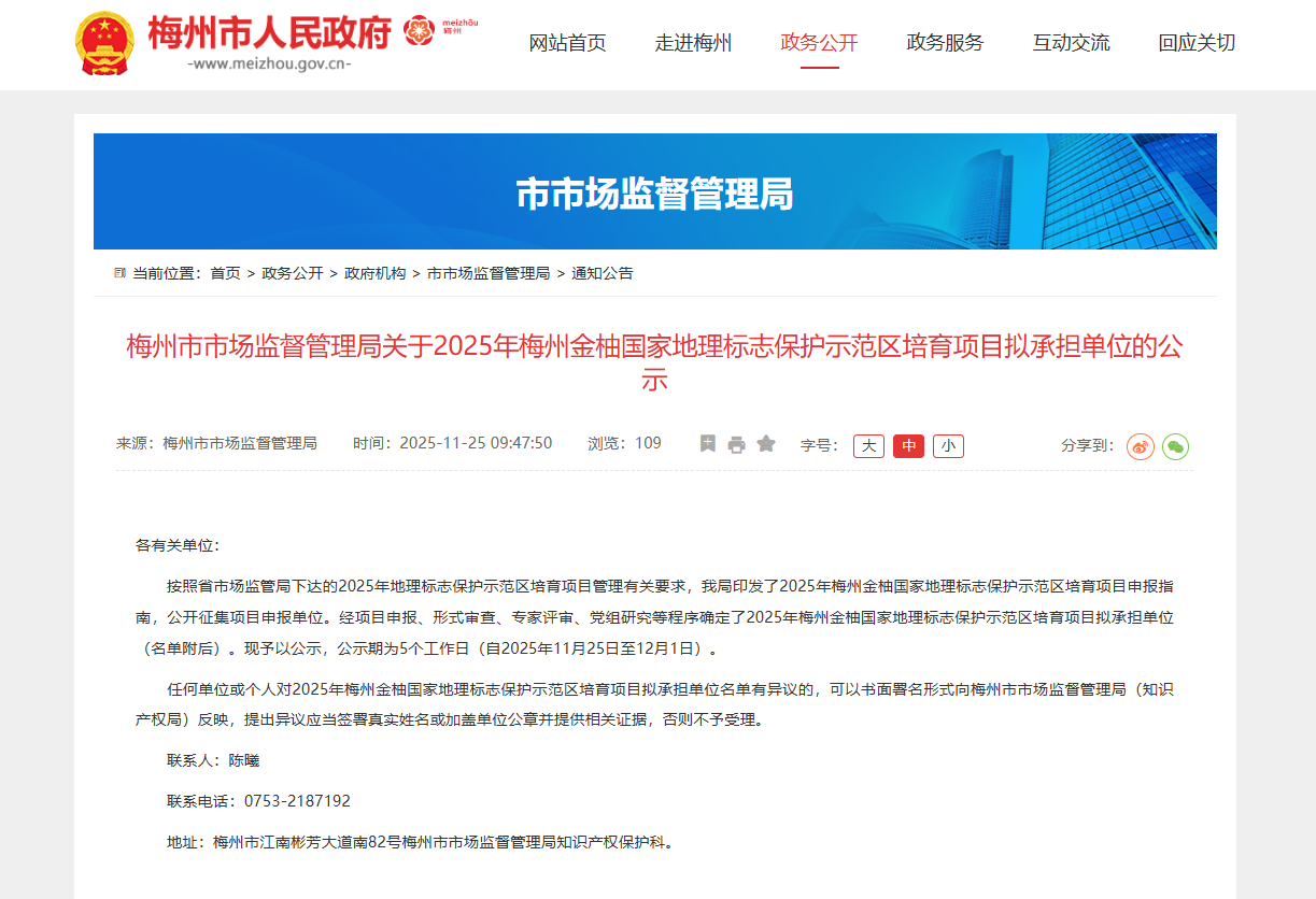 梅州市市场监督管理局关于2025年梅州金柚国家地理标志保护示范区培育项目拟承担单位的公示